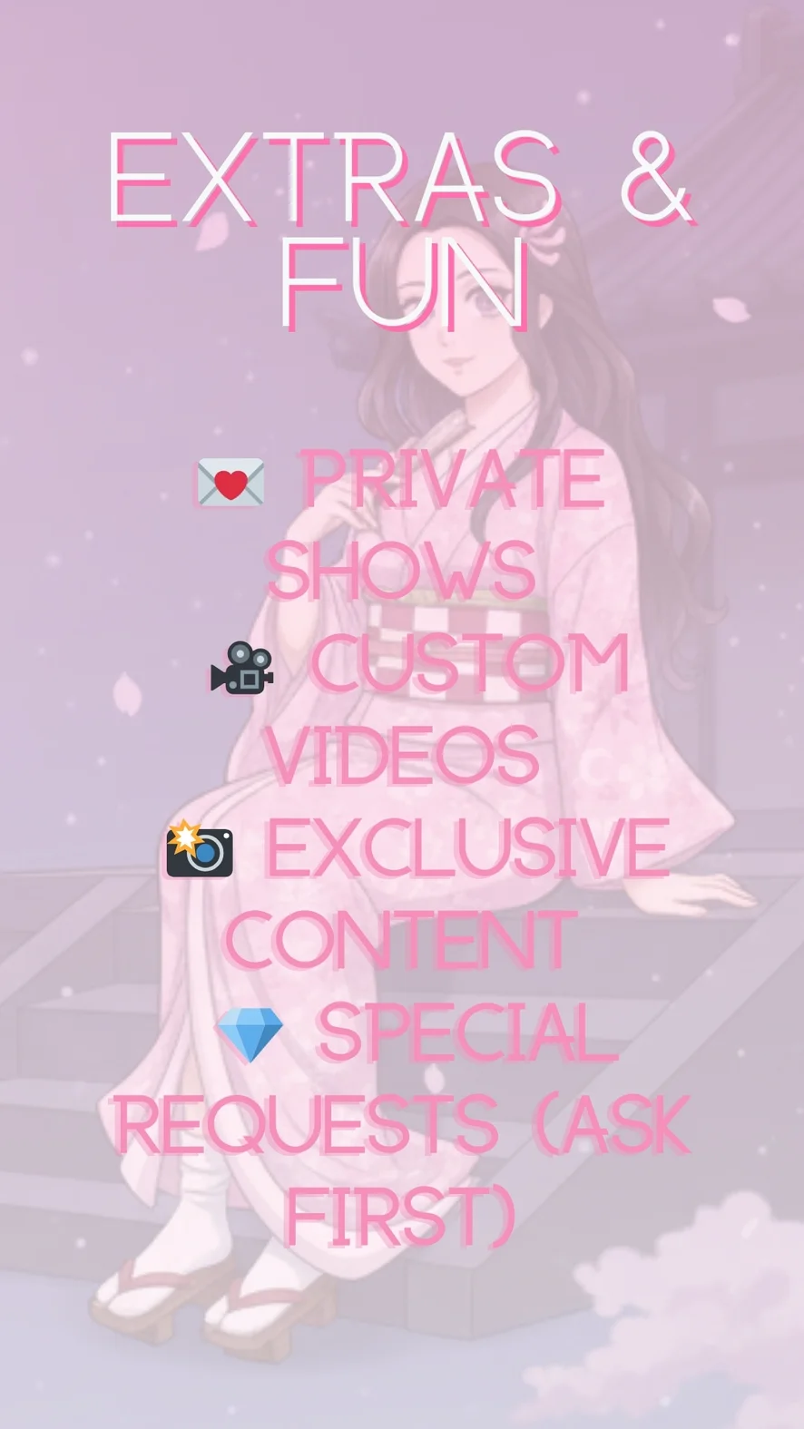 Ahegao, Spanking, Erotski ples, Camel Toe, Prljavi razgovor, Pokazivanje, Twerk, Pseća poza, Pušenje, Toples, Deeptrhaot, naked, Spank Ass, Striptiz, Creampie, Prstenjanje, Dildo ili vibrator, Fetiš stopala, Seks Igračke, Masturbacija, Gagging, Ispod suknje, destroy makeup 600tks, Anal dildo Glass 150, Doble penetracion 888Tks, Plug 100Tks, Ride Dildo, Anal 700tks, Duboko grlo, Tittyfuck, Orgazam, Lizanje stopala, Kaubojka, Potpetice